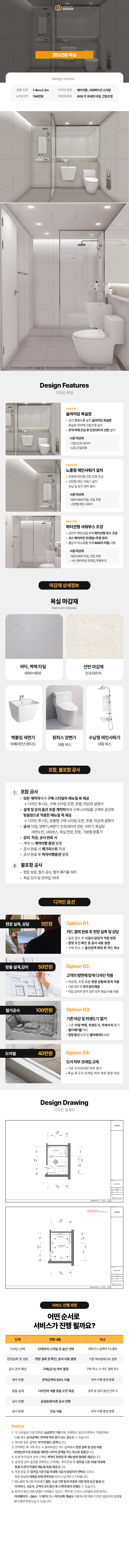 문이 달린 샤워부스 형태가 아닌 파티션 형태의 샤워부스로 디자인된 욕실 타입입니다. 바닥과 벽을 600×600 크기의 타일을 사용하여 군더더기 없이 깔끔한 욕실을 원하시는 분들께 추천 드리는 스타일입니다. 베이지톤의 타일과 벽면 월워싱과 욕실장 하부의 간접조명이 한층 더 부드러운 욕실의 분위기를 만드는 요소가 됩니다. 조적으로 조성한 욕실 하부 선반과 브랜드 위생도기 등 호텔식 고급스러운 디자인을 원하신다면 이 타입을 선택하시면 후회가 없으실 겁니다. ※ 해당 스타일의 "벽매입형 휴지 잡지 걸이"는 현장 상황에 따라 "일반형 휴지잡지 걸이"로 시공될 수 있습니다. ※ 공사 예산은 셀프견적에서 공간의 면적과 옵션을 선택하여 확인해 주시면 됩니다. ※ 디자인 상담 및 현장 실측은 구매하신 순서대로 진행됩니다.