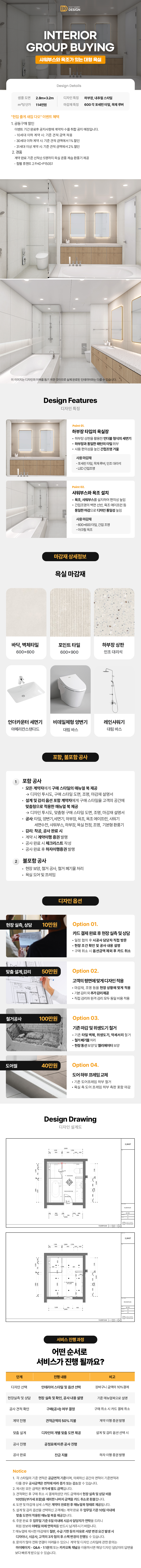 욕조와 샤워부스를 한 공간에 배치할 수 있는 40평형대 이상의 대형 욕실 디자인입니다. 최근 공사비와 마감재의 상승으로 인하여 이 정도의 디자인과 품질을 위해선 최소 2천만원 이상의 비용이 소요되나 '걱정마디자인'의 공동구매를 통해서는 1천만원 이하의 비용으로 퀄리티 높은 디자인 욕실을 만드실 수 있습니다. 전면 루버 하부장과 언더카운터 세면대, 간접조명이 있는 욕실 거울과 입체 패턴의 타일 등 마치 호텔 스위트룸에 오신 것과 같은 고급스러움을 느끼실 수 있을 겁니다. 600×600 크기의 바닥, 벽체 타일을 사용했고, 비데일체형 양변기와 에이프런 타입의 욕조 수전 등 지금까지 경험했던 욕실과는 다른 욕실을 경험하고 싶으실 때 선택할 수 있는 디자인 타입니다. 일반 주택의 경우 언더 형식의 욕조 디자인도 고려가 가능하니, 옵션에서 "맞춤설계, 감리"를 선택하셔서 공간에 적합한 디자인으로 공사를 하시기 바랍니다. ※ 해당 스타일의 "벽매입형 휴지 잡지 걸이"는 현장 상황에 따라 "일반형 휴지잡지 걸이"로 시공될 수 있습니다. ※ 공사 예산은 셀프견적에서 공간의 면적과 옵션을 선택하여 확인해 주시면 됩니다. ※ 디자인 상담 및 현장 실측은 구매하신 순서대로 진행됩니다.