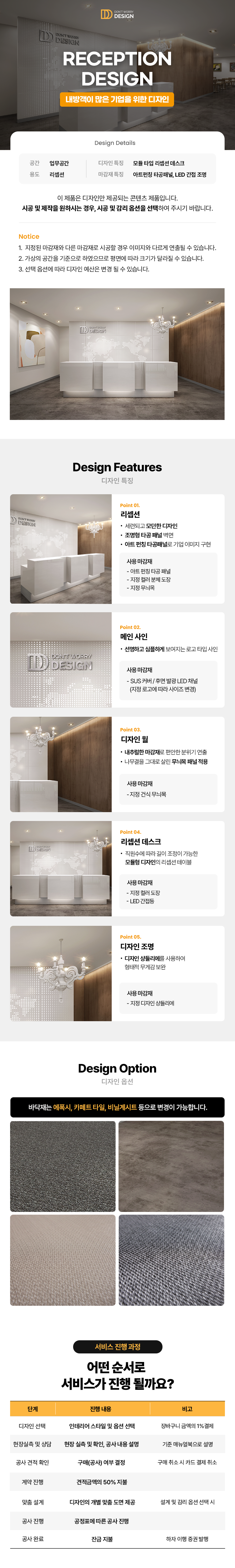 내방 고객이 많은 기업을 위한 리셉션 라운지를 소개합니다. 리셉션에 상주하는 직원의 수에 따라 길이를 늘리거나 줄일 수 있는 모듈형 디자인의 리셉션테이블과 매스로 정리된 공간 구분 벽체를 통해 직선적이고 강인한 공간 형태감을 표현했습니다. 내방객으로 하여금 가볍지 않고 세련된 모던함을 느낄 수 있도록 목재라는 소재와 디자인 샹들리에를 사용하여 형태적 무게감을 보완했습니다. 리셉션 데스크 뒷면의 이미지월에 사용된 아트 펀칭 타공 패널은 다양한 패턴의 타공이 가능하므로 기업의 이미지를 구현하기에 좋은 아이템입니다
