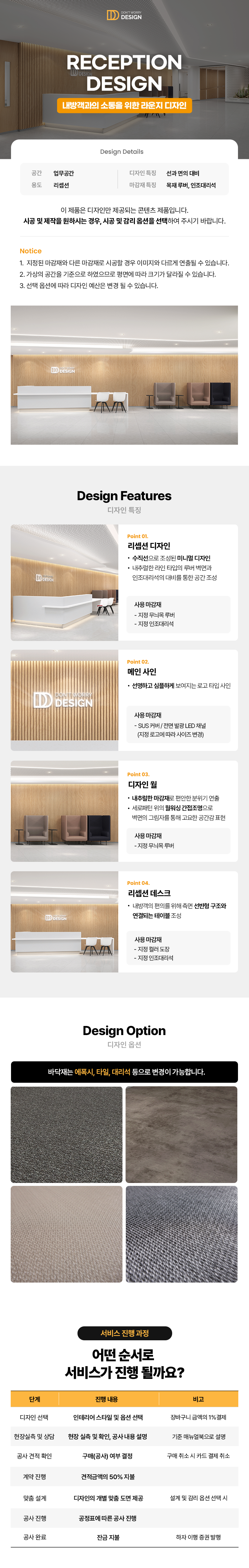 내방객과의 소통이나 상담이 필요한 갤러리, 일반 기업, 병원 등에서 다목적으로 활용할 수 있는 리셉션 라운지의 디자인을 소개합니다. 내방객과의 상담 및 소통이 가능한 뒷부분의 낮은 테이블은 전면의 높은 부분까지 연장하여 리플릿을 비치하거나 내방객이 잠시 지갑이나 손가방을 거치할 수 있도록 선반 기능을 추가했습니다 넓고 유리가 많은 공간에 들어가면 소리가 울리는 불편함을 해소하기 위해 천정은 원형 타공의 흡음보드를 사용하였고, 석고보드, 간접 조명으로 동선에 따른 패턴을 디자인 하였습니다.