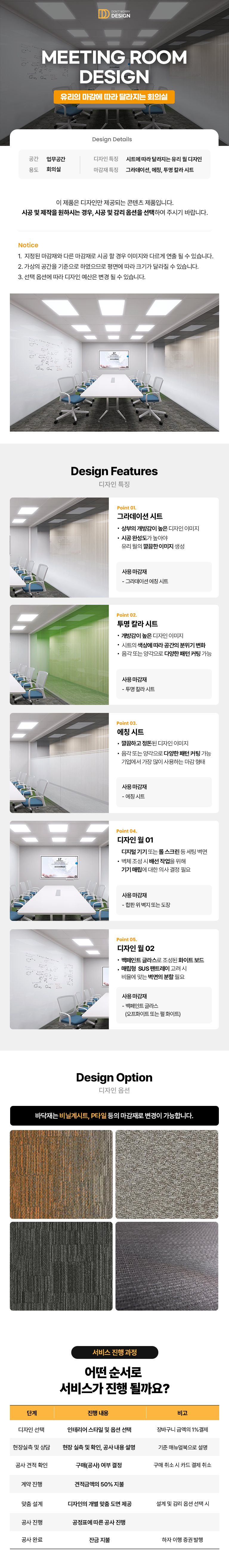 회의실의 유리 마감은 주택의 창호에 마감하는 커튼처럼 어떠한 소재를 선택하느냐에 따라 내부 공간의 느낌이 달라집니다. 깔끔하고 정돈된 이미지의 에칭시트와 에칭시트 보다 조금 더 개방감이 높은 그라데이션 시트, 기업의 CI 칼라를 활용할 수 있는 투명 칼라시트까지.. 하나의 공간에 적용된 각각의 시트 디자인의 느낌을 통해 우리 기업에 맞는 마감 타입을 선택 해 보실 수 있습니다.
