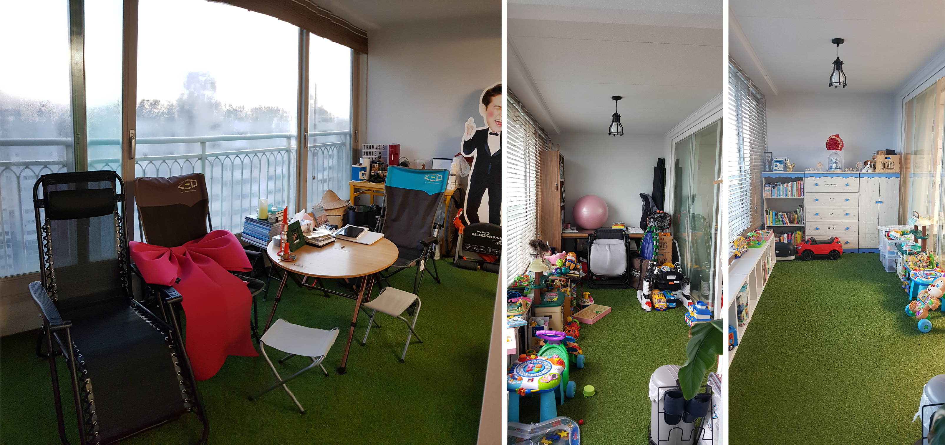 * 가족생활주기에 따른 공간 변화 사례, 왼쪽부터 가족 형성기(신혼), 자녀 한 명(아빠와 공동 공간 구성), 자녀 두 명(자녀만의 공간 구성)